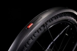 Beim Cube Nuroad Hybrid C:62 Race FE trifft ein leichter Bosch E-Antrieb auf einen überaus eleganten, ästhetisch ansprechenden Carbonrahmen und praktisches Zubehör wie Schutzbleche und Gepäckträger. Ein weiterer Gepäckträger kann an der Vollcarbongabel montiert werden. Und dank genügend Reifenfreiheit lassen sich neben den spezifizierten 45 mm auch 50 mm Reifen verbauen, sogar mit Schutzblechen.