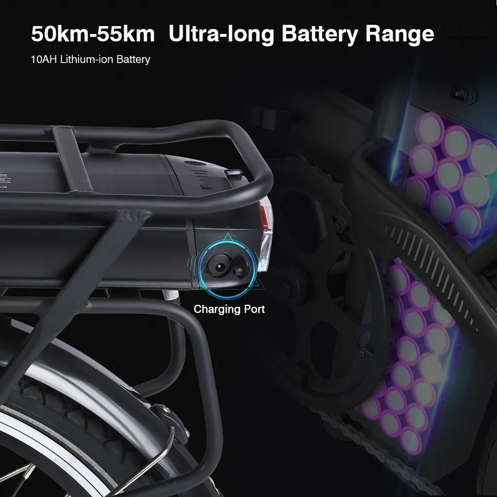 Sehr lange Batterie-Strecke:Kommt mit erweiterten 36V 10Ah Lithium-Ionen-Akku,vollständig aufgeladen werden nur in5bis 6 Stunden Ihr Fahrbereich wird bis zu 50km-55km, und die Höchstgeschwindigkeit bis 25 km / h. Die Batterie ist entfernbar, was bedeutet, dass esaufgeladen werden kannoban oder aus dem Rahmen.